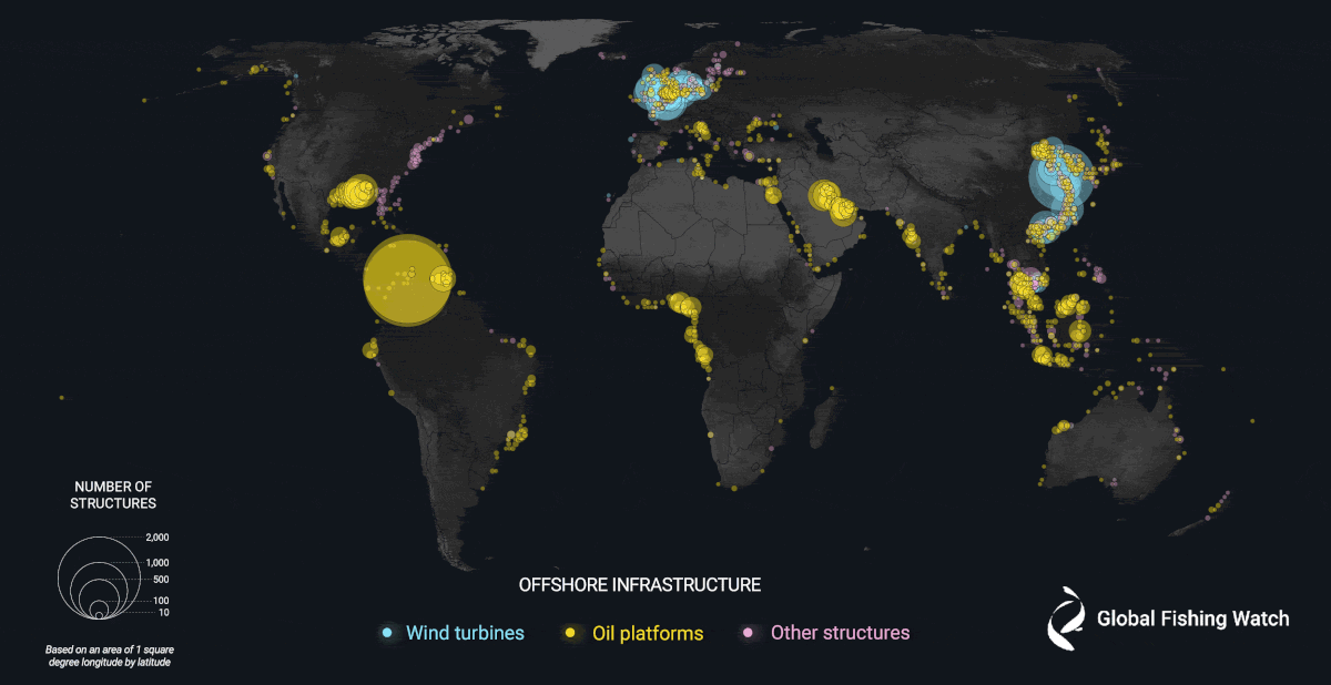 Two million gigabytes of satellite imagery from 2017-2021 were analyzed to detect offshore infrastructure in coastal waters across six continents where more than three-quarters of industrial activity is concentrated. ⓒ 2023 Global Fishing Watch