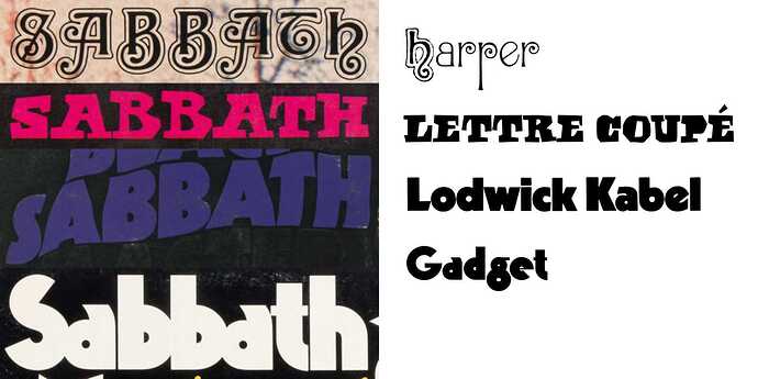 Though it is multiple generations removed, the titling style of the first, self-titled Black Sabbath album has its origins in an ornamented typeface from the Central Type Foundry called Harper, first released in 1882. The curly design was part of a wave of type styles from that era that tried to evoke a sense of exoticism through unusual forms.