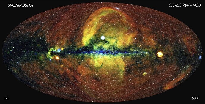 The eROSITA X-ray telescope completed its first full-sky survey earlier this year. This image shows the Milky Way stretching horizontally across the center of the ellipse. The red diffuse glow is hot gas expanding from the local bubble.
